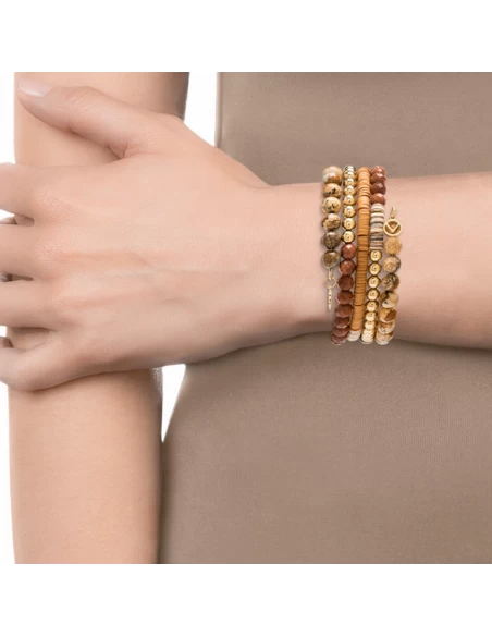 Pulsera tipo brazalete de 4 vueltas con bolas doradas y piedras en distintos tonos de marron.