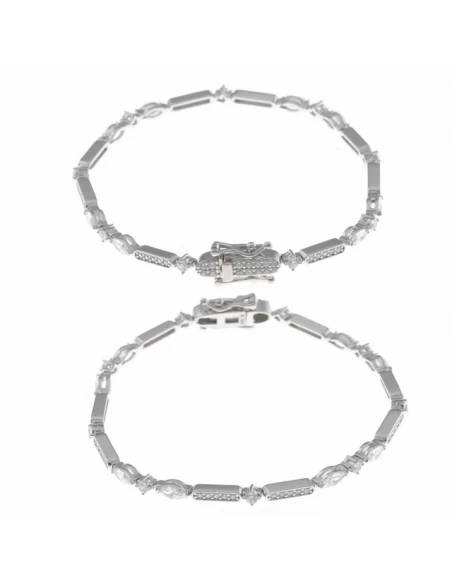 Pulsera de Plata de Ley con Baño de Rodio. Tira con Circonitas Blancas en tallas Pera, Diamante y Marquesa, engastadas en Garras. Cierre de Caja con dos ciierres de «8» de Seguridad.