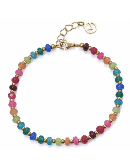 Fabricada en acero inoxidable IP Oro, .hilo de Piedras Naturales Multicolor. La Pulsera lleva un alargador de 3 cm.