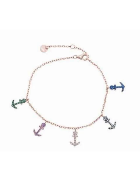Pulsera para mujer de la marca Salvatore Plata. Fabricada en Plata de Ley con baño de oro rosa. Pequeñas anclas cuajadas de circonitas talla «brillante» de distintos colores cuelgan de la cadena. Cierre de mosquetón. La cadena tiene tres asas para adptarla a tres medidas. Se sirve con estuche oficial.