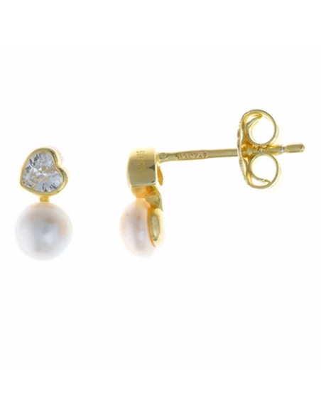 Pendientes de plata de Ley 925 mls. Bañados en Oro. Tu y Yo de Circonita Talla Corazón, con Perla de Agua Dulce. Cierre de presión.