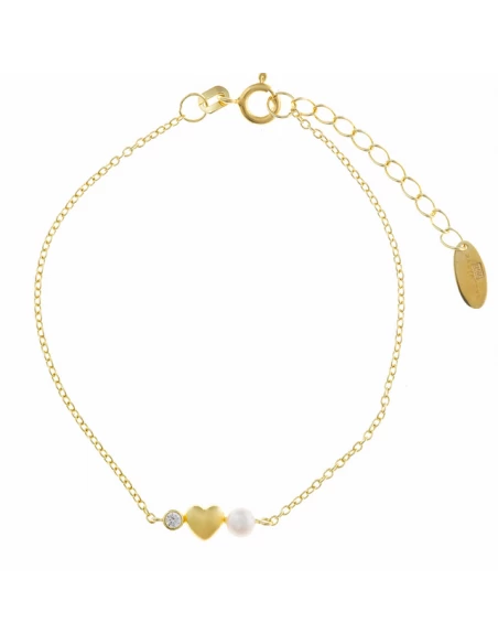 Pulsera de plata de Ley 925 mls. con cadena modelo Bilbao chapada en Oro con Circonita Talla Brillante en engastada en Chatón, Corazón ChapadoOro y Perla Cultivada. Cierre de mosquetón y alargador.