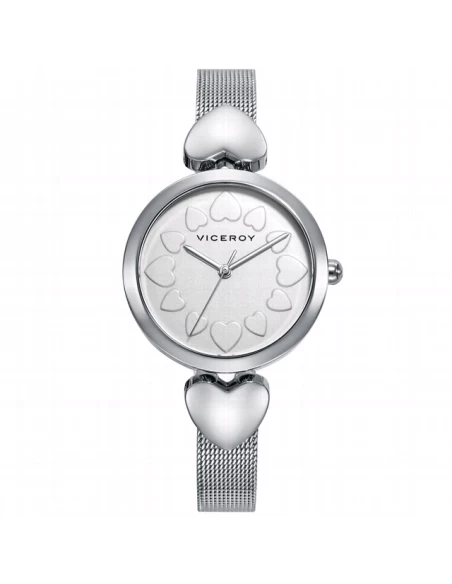 Caja de acero de 32 mm. de diametro, esfera de color plata con indices en forma de corazon y 3 agujas.