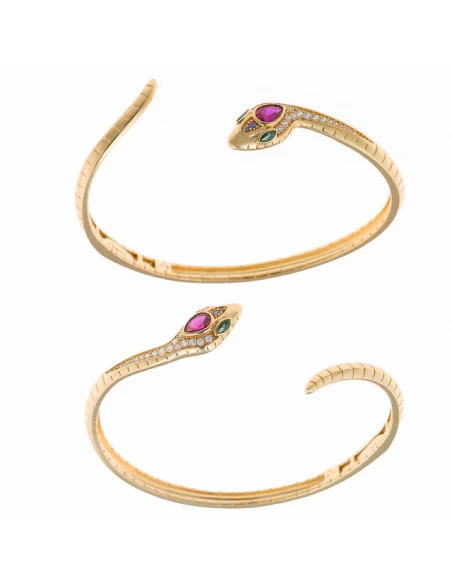 Brazalete en forma de serpiente con circonitas esmeralda y rubi.