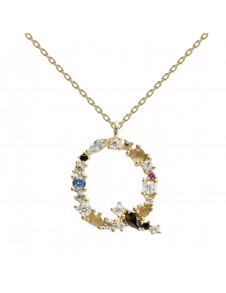 Colgante P dePaola. Para Mujer. Plata de Ley chapada en Oro. Letra Q con piedras: labradolita, aguamarina y circonita de color.Cadena es ajustable desde 35cm a 50cm.
