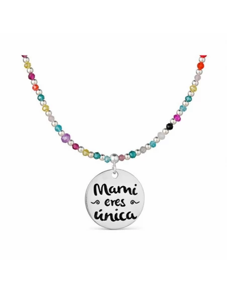 Collar con bolas de plata y piedras de color con disco central con inscripcion «mami eres unica».