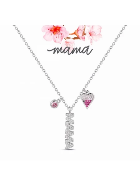 Cadena forsait de 38 cm. + 5 cm. de alargador con MAMA en circonitas y corazon de circonitas rosas. Cierre de mosqueton.
