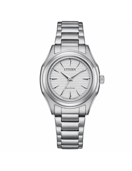 Movimiento Eco Drive J710 con reserva de carga 8 meses. Caja y Brazalete de acero de 29’40 mm de diámetro y 8’3 mm de grosor. Peso 72 Gramos. Tres agujas.
