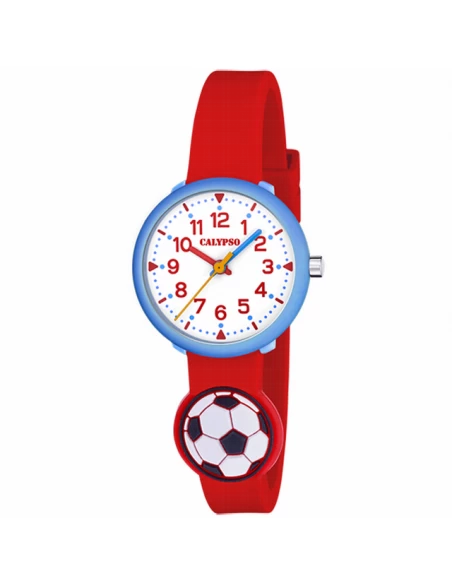 Caja de plástico azul y correa de caucho rojo con un balón. Esfera blanca con numeración árabe y tres agujas.