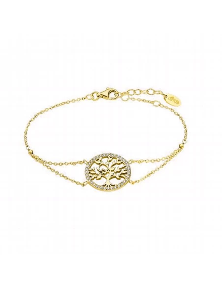 Pulsera de la marca Lotus Silver. Fabricada en plata de ley chapada en oro. Doble cadena con arbol de la vida calado borde circonitas.