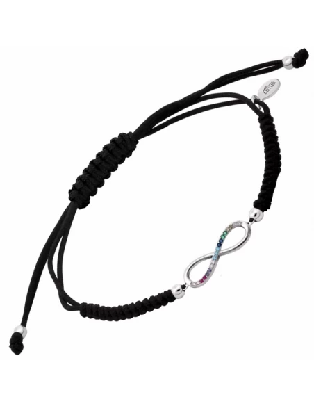 Pulsera de nylon negro con infinito de circonitas multicolor.