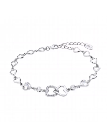 Pulsera de 16 cm mas 3 de alargador con corazones con circonitas de 2,5 mm. y 2 chatones de circonita de 2,25 mm. y centro 2 corazones entrelazados con 22 circonitas engastadas de 1,1 mm. Cierre mosqueton.