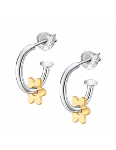 Pendientes en forma de aro de 13 mm x 2 mm con flor chapada en oro. Cierre de presion.