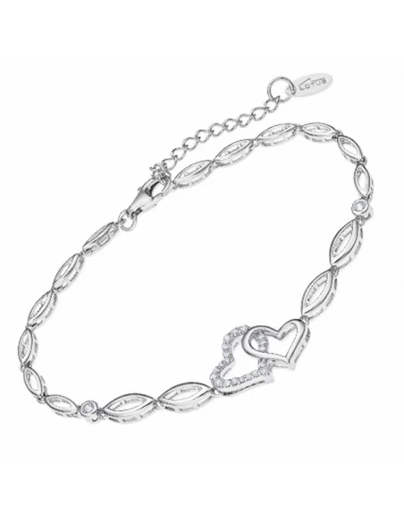 Pulsera de plata con dos corazones, uno de ellos con circonitas engarzadas en garras y eslabones ovales con dos chatones con circonita, intercalados. Cierre de mosquetón y alargador .