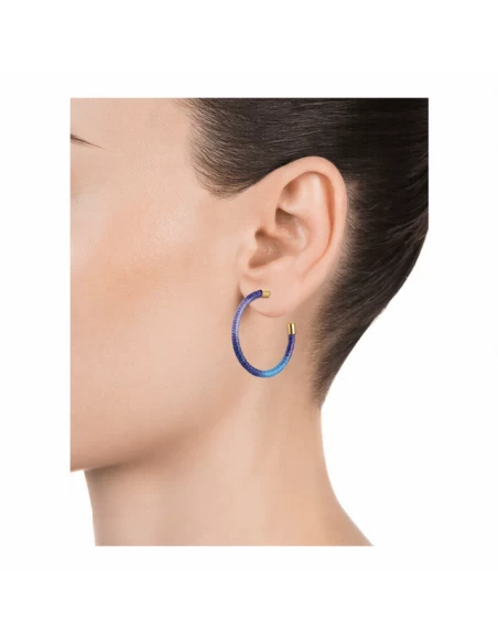 Pendientes criolla de 42×3 mm. con cordon en tonos morados y azules. Cierre de presion.