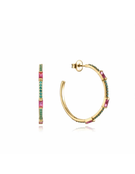 Pendientes de aro con piedras en color rosas y verdes. Cierre de presion.