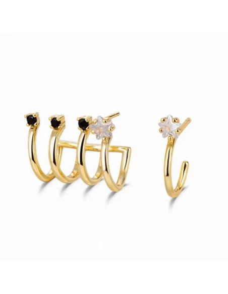 Pendientes de Plata de Ley Chapada en Oro. Tres Hilos con Piedra Negra un Hilo con Flor Circonita. Cierre de Presión.