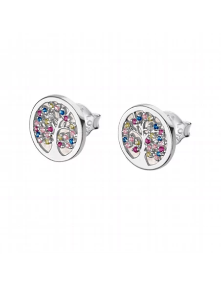 Pendientes redondos de 12 mm de diametro con fondo de madreperla y arbol de la vida con circonitas de color, cierre a presion.