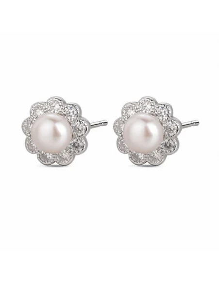 Pendientes Plata Rodiada. Flor De Plata Cuajada De Circonitas Y Perla Natural De11 Mm ø.