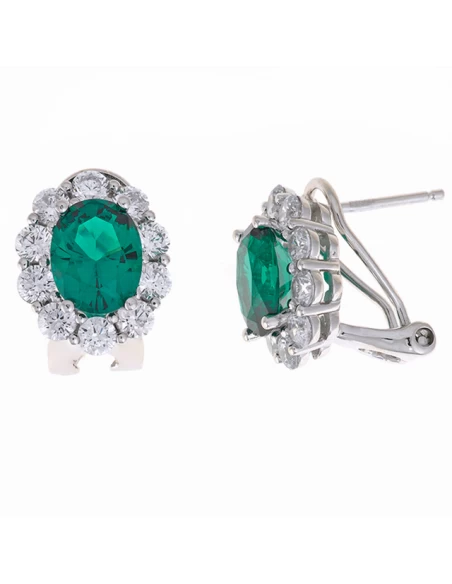 Pendientes orla de circonitas blancas, talla brillante, engastadas en garras con circonita verde, talla oval, engastada en garras en el centro de la orla. Cierre omega.