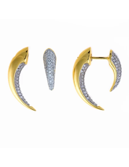 Pendientes de colmillo, cuajados de circonitas,de plata de ley y bañados en oro. Uno de los colmillos sirve de cierre de presión.