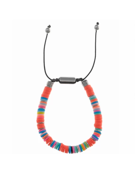 Pulsera con núcleo de seda negra, cierre corredizo y discos de resina en tonos rosas.