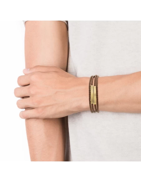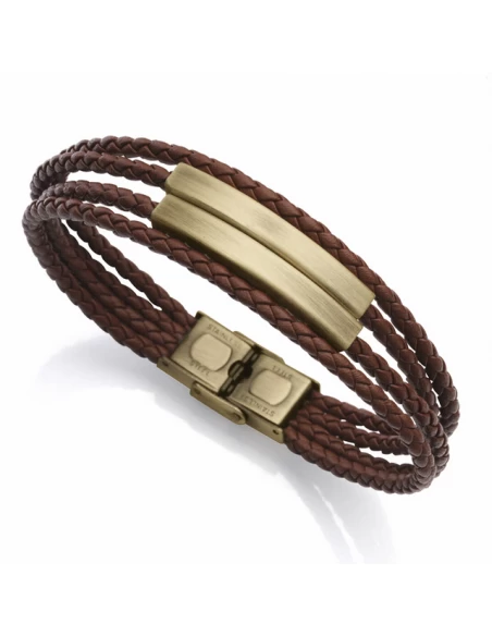 Pulsera 4 tiras en piel marron trenzada con 2 chapas de 35×5 mm. que se puede grabar. Diametro de 21,5 cm.