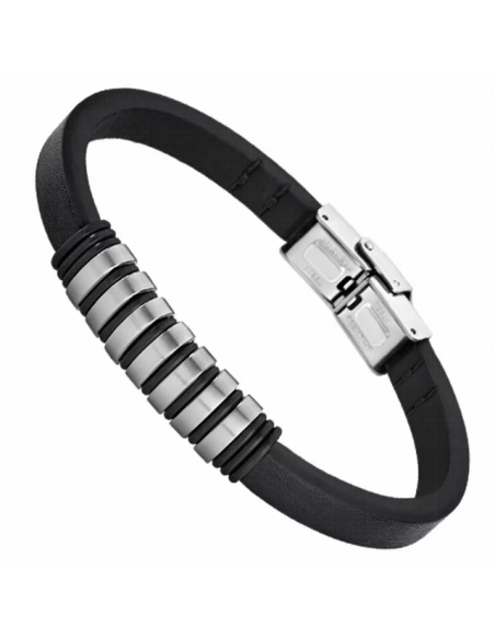 Pulsera de cuero negro con motivos de acero en el centro. Largo de 22 cm. y cierre de iman.