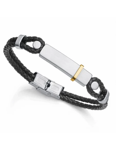 Pulsera de piel trenzada Negra con motivo central acero y acero IP Oro.