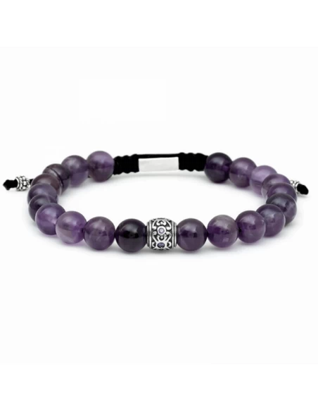 Pulsera de Plata con Bolas de amatista de 8 mm de diámetro, con abalorio central de plata y seda negra con dos ablarios de plata. Cierre de nudos de corredera.