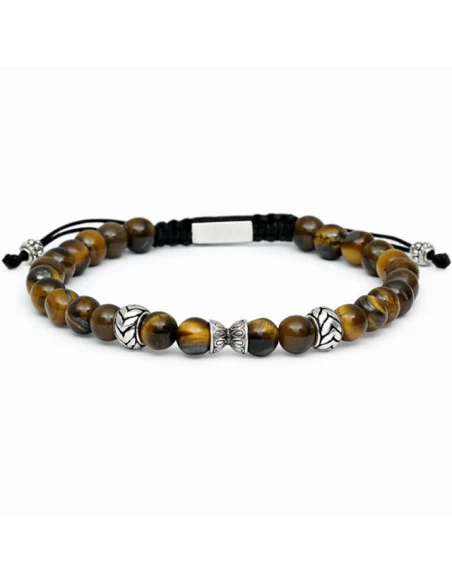 Pulsera de Plata con Bolas de Ojos de Gato de 8 mm de diámetro, con tres abalorios de plata centrales y seda negra con dos ablarios de plata. Cierre de nudos de corredera.