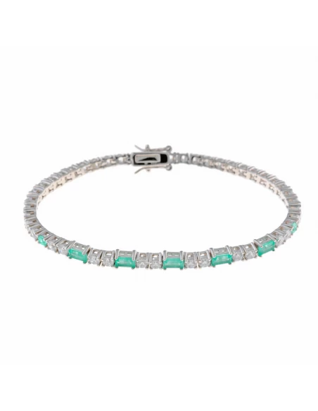 Pulsera de plata con circonitas talla brillante y piedras de color menta hielo talla esmeralda, engastadas todas las piedras en garras. Cierre de caja con doble cierre de ocho de seguridad.