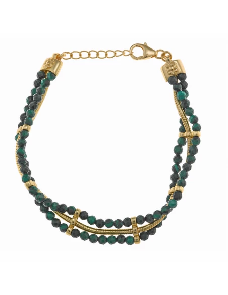 Pulsera de Plata de Ley 925 mls, Chapada en Oro. Dos Hilos de Malaquitas Facetadas y un a Cadena Cola de Topo, Chapada en Oro. Cierre de Mosquetón. Largo de 17 cm, con un suplemento de 2,5 cm.