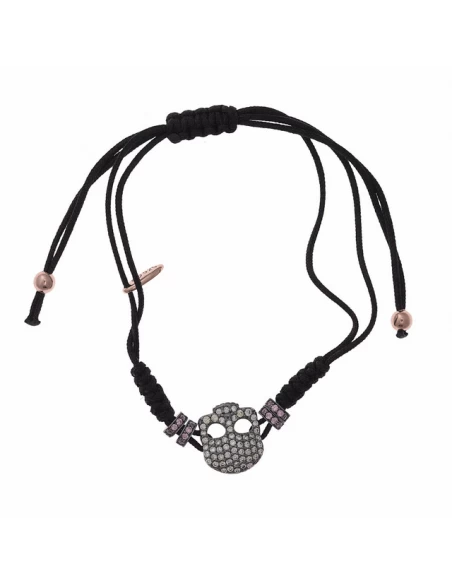 Pulsera en Plata de Ley 925 mls Bañada en Rutenio. Calavera con Circonitas Amarillas y Rosa. Pulsera de hilo Macramé. Cierre corredizo ajustable. Llargo 21cm.