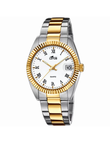 Caja de acero de 38 mm con bisel exterior gallonado en acero IP Oro. Brazalete de acero inoxidable combinado IP Oro. La esfera lleva índices de números romanos. Dos agujas luminiscentes y segundero central. Calendario día del mes colocado a las 3.