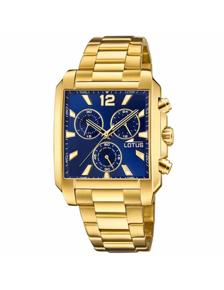 Esfera color azul. Tres agujas IP Oro. Pulsadores y corona IP Oro. Cristal mineral.