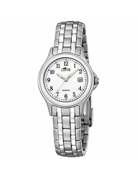 La esfera en color blanco, tcon numeración árabe. Dos agujas luminiscentes y segundero central. Calendario día del mes colocado a las 3.