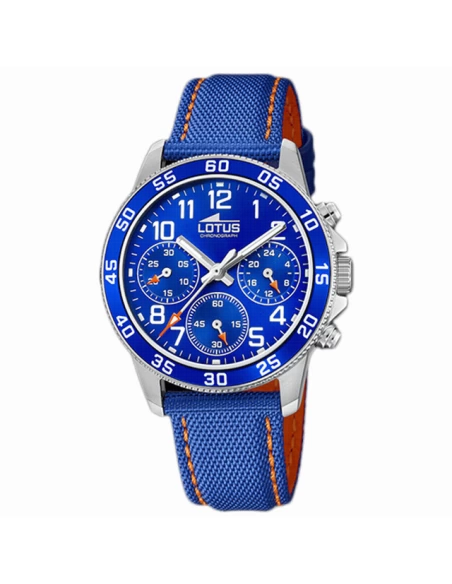 Caja de acero de 36 mm. Correa de piel y nylon de color azul con pespunte naranja. Bisel azulo con números árabes. Esfera con números pintados. Dos agujas plateadas y segundero central.