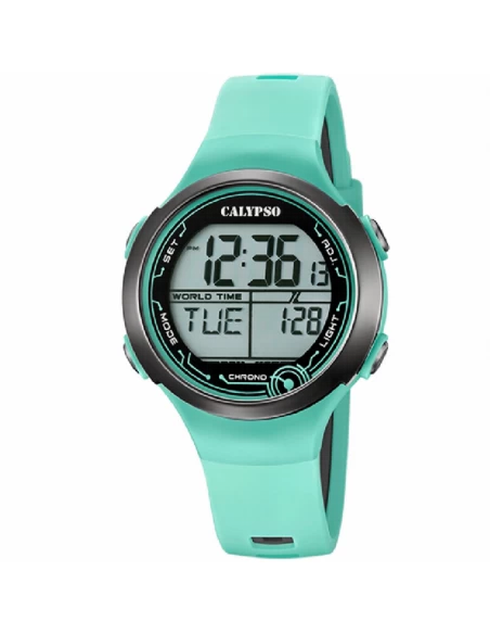 Caja de plástico de 40 mm de diámetro y tapa de fondo con tornillos. Estanqueidad de 10 atm. Cristal de plástico. Correa plastico. Funciones: calendario, cronógrafo y alarma.