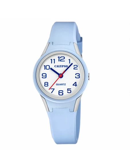 Caja de pástico de 29,3 mm. caja y correa de caucho azul. Esfera blanca con numeración árabe y tres agujas. Estanqueidad de 10 atmósferas.