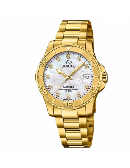 El reloj para mujer Jaguar J898/1, de la Colección Couple Diver, destaca por su diseño en color dorado con esfera blanco nácar e índices dorados, garantizando una elegancia atemporal. Su cristal de zafiro, resistente a los arañazos y con tratamiento antirreflejos, proporciona una visibilidad impecable en cualquier condición de luz.