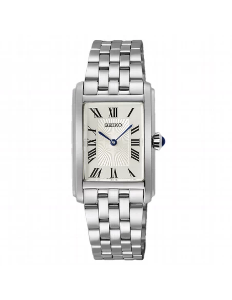 Movimiento de cuarzo. Acero rectangular de acero de dimensiones. Grosor:6,9 mm, Diámetro:22,2 mm, Largo:33,1 mm. Esfera con índices de